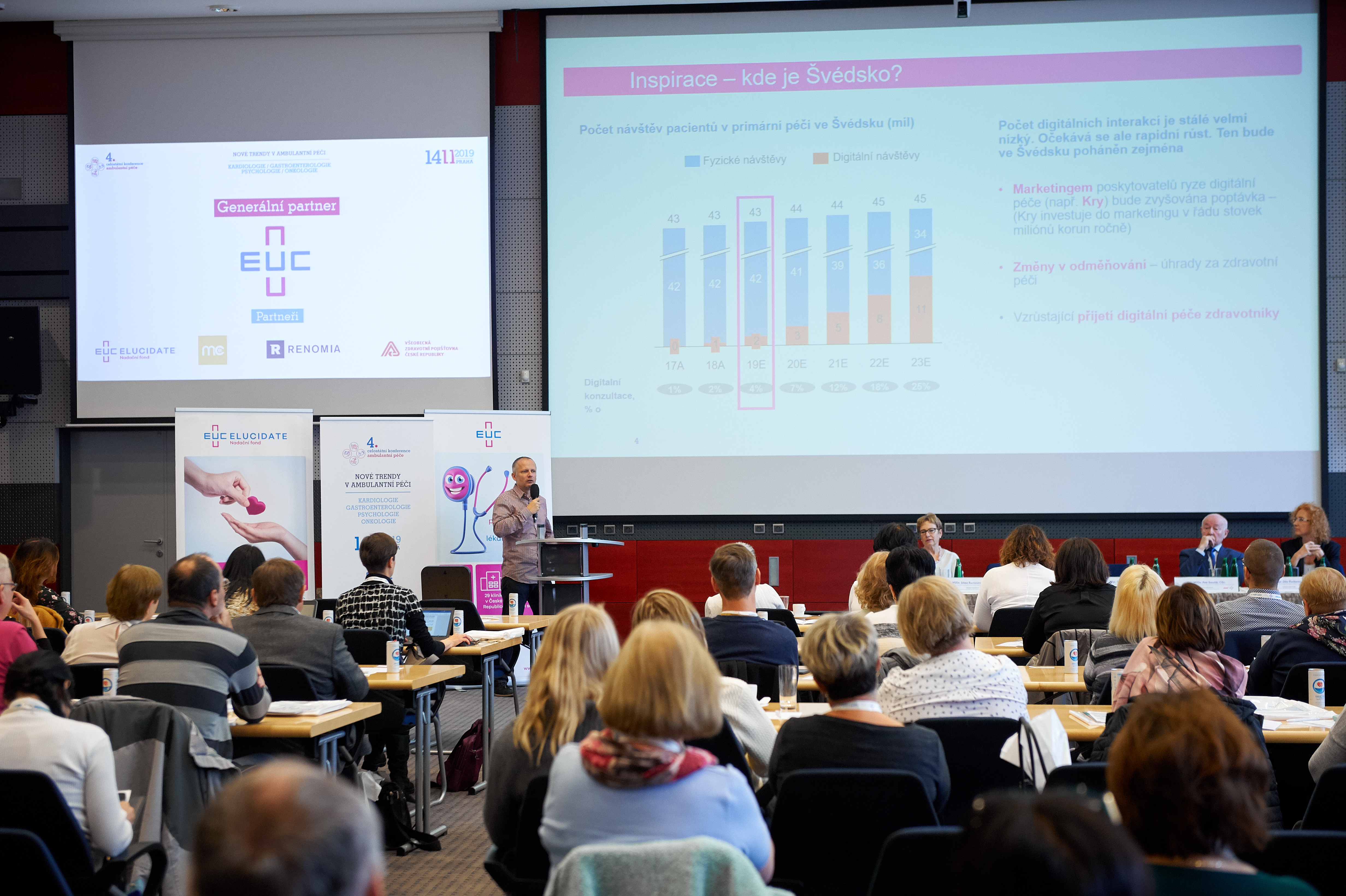 Již počtvrté se zdravotnická skupina EUC stala generálním partnerem celostátní konference ambulantní péče. Letošní ročník se věnoval kardiologii, gastroenterologii, onkologii, psychologii a virtuální klinice. Konferenci doplnily také dva workshopy zaměřené na radiodiagnostiku a kardiopulmonální resuscitaci. Atraktivním doplněním celé akce byla také beseda se záchranářem na téma Záchranář v ambulanci.